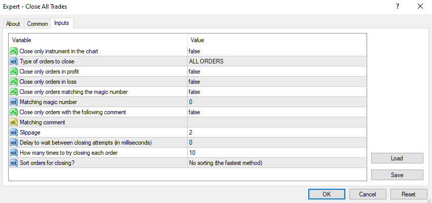 Delay : The delay in milliseconds between closing attempts for each trade.